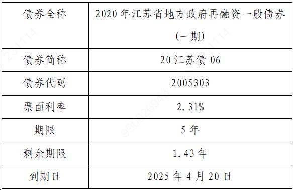 1.2020年江苏省地方政府再融资一般债券(一期),债券简称20江苏债06,债券代码2005303,为5年期固定利率债券,剩余期限为1.43年,按年付息。本期债券票面利率为2.31%,债券起息日为2020年4月20日,下一付息日为2024年4月20日,兑付日为2025年4月20日。如遇节假日,则支付日顺延(下同)。