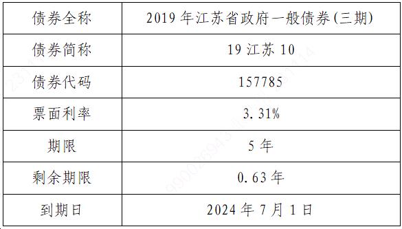 2.2019年江苏省政府一般债券(三期),债券简称19江苏10,债券代码157785,为5年期固定利率债券,剩余期限为0.63年,按年付息。本期债券票面利率为3.31%,债券起息日为2019年7月1日,下一付息日为2024年7月1日,兑付日为2024年7月1日。如遇节假日,则支付日顺延。